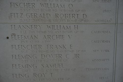 Pvt Archie V. Fleeman enlisted in Los Angeles, California at on 6 April 1943.He was declared dead one day and one year after he was reported missing in action.