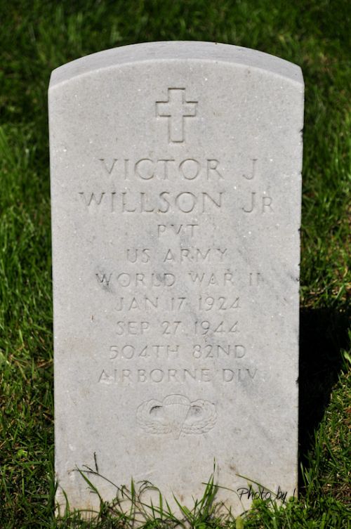 Pvt Victor J. Willson Jr. enlisted in Buffalo, New York on 15 December 1942.His remains were recovered on 23 March 1988 at Groesbeek, Wylerbaan-Den Heuvel, the Netherlands. His unit was part of the massive ground and airborne assault, Operation Market-Garden. He is buried at Arlington National Cemetery, Virginia Section 34, site 101-A1.