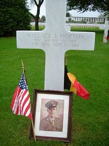 Pfc Wallace J. Horton enlisted in Roanoke, Virginia on 17 August 1943.He was killed by machinegun fire at a crossroad in 's-Gravenvoeren (Fouron Le Comte) in Belgium during the liberation of the village.