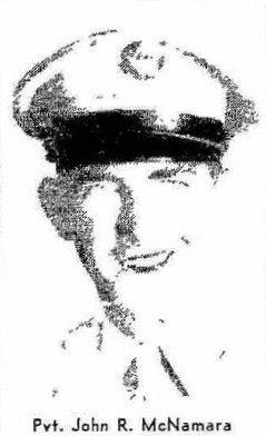 Pvt John R. Mc Namara volunteered for the US Army in Boston, Massachusetts on 24 October 1942.Pvt Mc Namara has three brothers in the service, Pvt Paul, serving in France, Pfc William in Hawai and Seaman Walter Mc Namara at Sampson Naval Training station.