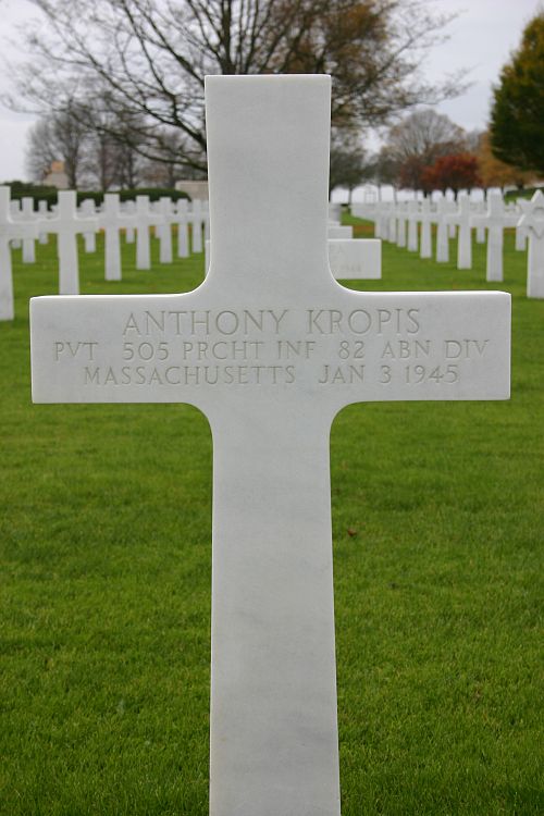 Pvt Anthony Kropis enlisted in Boston, Massachusetts on 23 July 1943.The plan on 3 January for taking Fosse was for G and H Companies to bypass the town and take up positions on high ground to the southwest from which they could provide supporting fire while I Company attacked into the town from the north. All was going well until I Company emerged from a wood two hundred yards from Fosse's outskirts and got pinned down by small arms, machine gun, and artillery fire. The commanding officer, Capt McPheeters, was killed instantly, as was the only other officer, Lt Degenhardt. In total, the company suffered 13 casualties. They are remembered on a monument, situated on the north side of the town in a street called Sur le Meez.