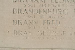 "Gunner-engineer on a Flying Fortress, T/Sgt Fred Brann, widely known sports writer and former publicity director of the Buffalo Baseball Club, failed to return from a raid on Germany on December 20th, 1943. He went overseas with his air crew at the end of 1943 and had completed two bombing missions. On both these missions, his Fort was hit by flak, but he and his crewmates escaped injury. The plane was on its third bombing run when it failed to return. In the service nearly two years, Sgt Brann completed air crew training in April 1943, qualifying as flight engineer and top turret gunner. He went overseas as a staff sergeant and was promoted to technical sergeant after getting into action."