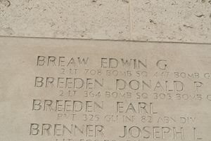 2nd Lt Edwin G. Breaw attended Iowa State College in Ames, Iowa and was employed at Kiewits and Sons.The aircraft left formation at approximately 5550N-0320E at 1140 hours. No flak had been encountered up to this point, and the cause for leaving formation is unknown. The aircraft was under control when last observed. At 1459 hours, the MFDF section gave the aircraft's position at 5230N-0325E and stated that the aircraft was about to ditch. P-53s were sent to the search area. The search was unsuccessful and was terminated by darkness. The search was continued on the morning of 5 November 1944 due to a gale the night before. Eight Sterlings and 4 Warwicks continued the search, and at 5250N-0350E, wreckage and an empty dinghy were located with no sign of any personnel. However, there was nothing found to confirm that this wreckage was aircraft 42-32081.