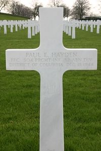 Pfc Paul Hayden joined the Air Corps of the Regular Army at Fort George G. Meade, Maryland on 28 June 1941. He was later transferred to the paratroopers.He served in North Africa, in Italy and participated in D-Day landing.