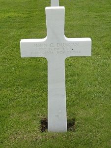 Pfc John C. Duncan worked in the wrapping departement of the Pioneer Rubber Mills. He enlisted in San Francisco, California on 3 December 1941.He was killed shortly after he rejoined his unit from a hospital in England where he had spent six months recovering from serious leg wounds.