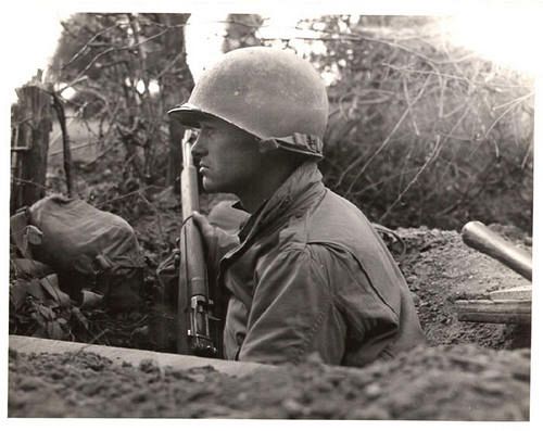 The picture shows Pfc Adams awaiting German counterattacks in his foxhole in the vicinity of Bardenberg and Würselen, Germany on 17 October 1944.He was awarded the Bronze Star Medal for leading a patrol into enemy territory on 26 November 1944. The same day, he was also awarded the Silver Star Medal for destroying enemy tanks. The citation reads: Pfc Adams, with a companion, knocked out two tanks and held four others at bay with a bazooka during a 30th Division action in Germany 26 November. The Germans had struck back at Pfc Adams's company with six tanks and supporting infantry. Using a bazooka, PfcAdams and his comrade advanced to meet the onslaught and fought them off untill artillery caused the remaining tanks to withdraw. 'Their courageous action was primarly responsible for the repulse of the counterattack.