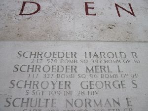 2nd Lt Harold R. Schroeder enlisted in Kansas City, Kansas on 7 April 1942.The aircraft was attacked by enemy fighters in de vicinity of cost out, north of the target at Vegesack, Bremen, Germany after the Group attacked this target. No German reports were available on the final situation regarding this crew and the 'Exterminator'. It could be concluded only that this aircrew went down just off shore into the North Sea waters, and never recovered.