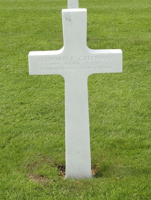 Pvt Leonard F. Greenway enlisted in Philadelphia, Pennsylvania on 21 May 1943.Source of information: Terry Hirsch, André Koch, Carla Mans, www.abmc.gov, www.wwiimemorial.com, www.archives.gov – WWII Enlistment Record, www.ancestry.com - Headstone and Interment Record / Pennsylvania Veteran Compensation Application Files