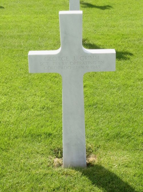 Sgt Grimm was killed in Belgium on January 9 when he was struck by a train. He had been in service for three years and was stationed at Camp Claiborne prior to going overseas four months before his death. He was serving with a railway battalion in Ottignies, Belgium.Sergeant Grimm was first buried at Fosse Cemetery at Namur, Belgium at Block I, Row 9, Grave 163.