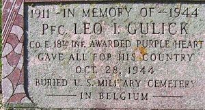 Pfc Leo I. Gulick was a trucker for the Farmers' Grain & Co-operative Company.He enlisted at Camp Dodge, Iowa on 21 March 1944 and arrived overseas on 15 September 1944.