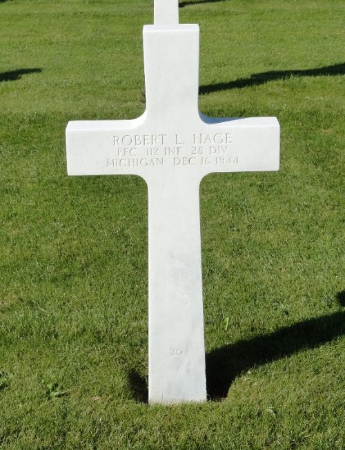 Pfc Robert L. Hage attended Lee High School and was employed by the Holland American Wafer Company before he enlisted in Kalamazoo, Michigan on 3 April 1943.Pfc Hage was first buried at the Temporary American Military Cemetery of Foy, Belgium.