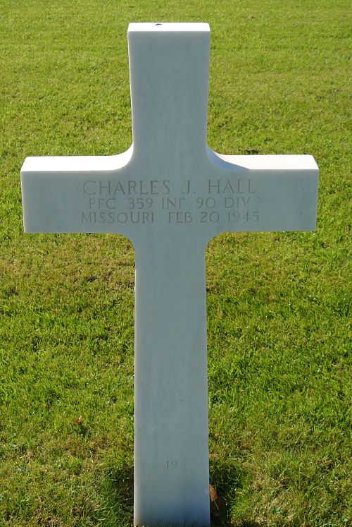 Pfc Charles J. Hall graduated from high school and enlisted at Jefferson Barracks on 16 August 1944.Pfc Hall was first buried at the Temporary American Military Cemetery of Foy, Belgium.