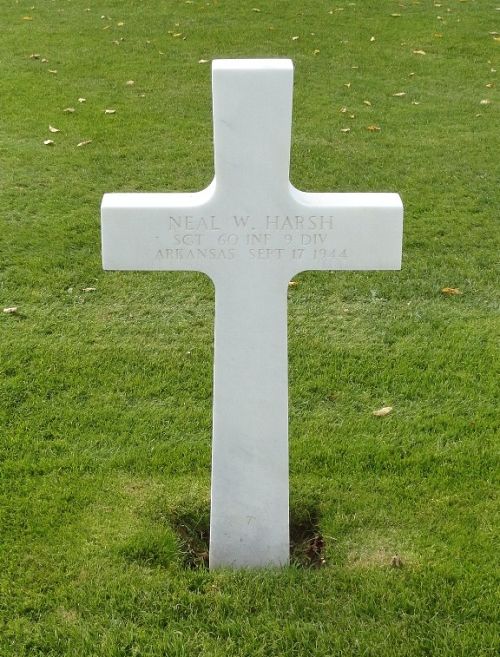 Sgt Neal W. Harsh was first buried at the Temporary American Military Cemetery of Fosse, Belgium.Source of information: Peter Schouteten, Astrid van Erp, www.abmc.gov, www.wwiimemorial.com, www.ancestry.com - Headstone and Interment Record / 1930 Census / Family Tree, http://9thinfantrydivision.net