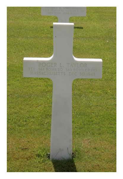 1st Lt. Roger L. Taylor enlisted at Fort Devens, Massachusetts on 3 August 1942.The pilot had to feather an engine and soon lagged behind the formation. He peeled of and headed back towards England, apparently under control when last seen. They were attacked by two ME110s at 11:50 hours and went down. 1st Lt. Eldon N. Colby states: "Lt. Taylor was last seen as he left the airplane when we bailed out near Charleville, France after fighter attacks had knocked out two engines and the plane was burning badly. At the time Lt. Taylor bailed out he was okay. Ten chutes were counted by crew members. However, after hitting the ground, none of us have heard of Lt. Roger L. Taylor. We were all under the impression that he was a prisoner of war until we arrived back in the States and found out that his parents had never heard from him."