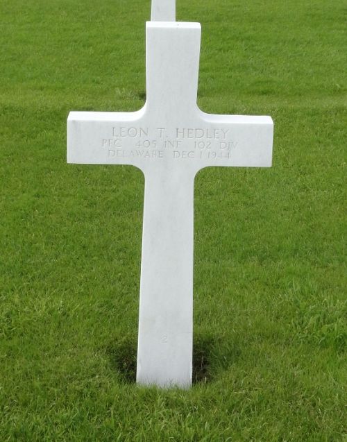 Pfc Leon T. Hedley worked for the Baltimore and Ohio Railroad Co. before he enlisted on 24 November 1943. He became sick while in training at Camp Swift, Texas and had to be hospitalized. He was offered a medical discharge but refused on the grounds that leaving the service might mean some young married man or father would have to fill his place.Source of information: Peter Schouteten, Terry Hirsch, www.abmc.gov, www.ancestry.com - 1940 Census / Headstone and Interment Record, www.archives.delaware.gov, www.findagrave.com - RussPickett, www.newspapers.com - The Morning News