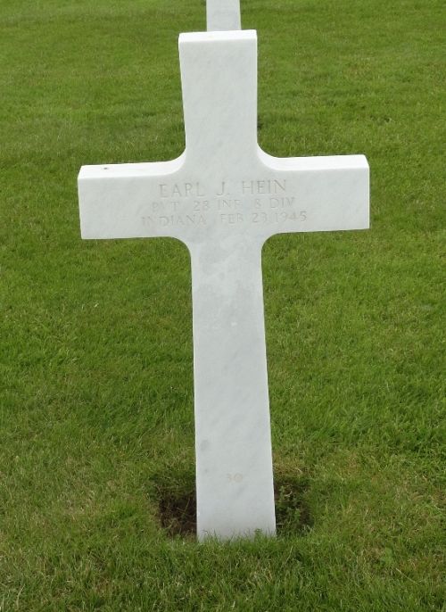Pvt Earl J. Hein enlisted in Fort Benjamin Harrison, Indiana on 15 June 1944 and received basic training at Camp Croft, S.C., going overseas in November.Prior to his induction he was employed by the Seberger Concrete Block company and served on the Black Oak volunteer fire department.