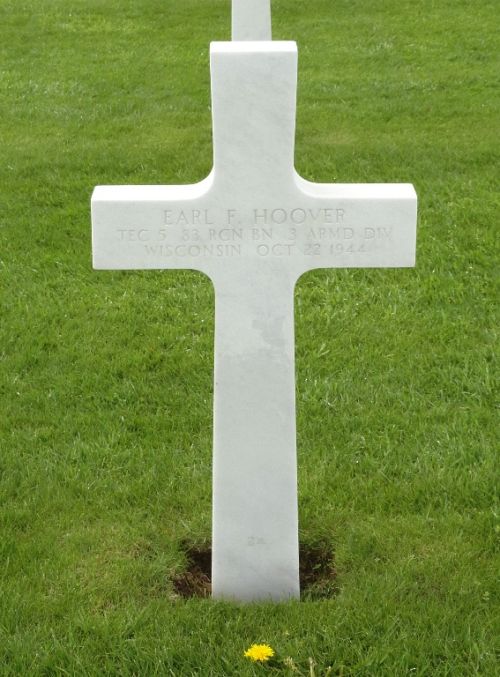 T/5 Earl F. Hoover enlisted in Milwaukee, Wisconsin on 17 June 1941 and was sent overseas in August 1943.Source of information: Peter Schouteten, Carla Mans, www.abmc.gov, www.wwiimemorial.com, www.archives.gov - WWII Enlistment Record, www.ancestry.com - Headstone and Interment Record / U.S. WWII Draft Cards Young Men / 1920 Census