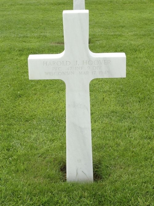 Pfc Harold J. Hoover graduated from Cudahy High School. He was employed by Cudahy Bros.Source of information: Peter Schouteten, Terry Hirsch, www.abmc.gov, www.ancestry.com - Headstone and Interment Record / 1940 Census, http://www.linkstothepast.com/milwaukee/mkewwii.php, http://9thinfantrydivision.net, WWII Draft Registration Card; Milwaukee Journal - 17 April 1945