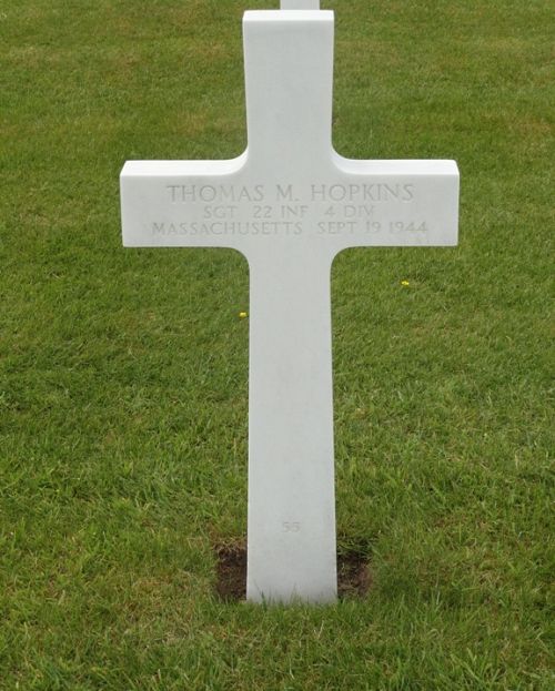 Sgt Thomas M. Hopkins enlisted at Fort Devens, Massachusetts on 26 February 1942.He was first buried at the Temporary American Military Cemetery of Fosse, Belgium.