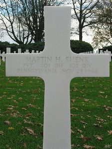 Martin H. Shenk was employed by the Manheim Manufacturing and Belting Company.He enlisted in Philadelphia, Pennsylvania on 16 October 1942 and trained at Camp Plauche, Louisiana. He was sent overseas in July 1944.