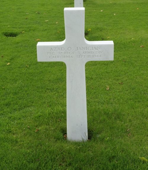 Pfc Azad O. Janigian enlisted in Fort MacArthur San Pedro, California on 17 January 1942.He was first buried at Temporary American Military Cemetery Fosse, Belgium Block E, Row 5, Grave 85.