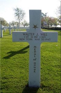 Walter J. Will was young when he joined the Army, his mother had to sign papers for his acceptance.He was awarded the Medal of Honor posthumously on 17 October 1945. The citation cited: During an attack on powerful enemy positions on 30 March 1945, while serving with Company K, 18th Infantry Regiment, 1st Infantry Division, in action at Eisern, Germany. First Lieutenant Will courageously exposed himself to withering hostile fire to rescue two wounded men and then, although painfully wounded himself, made a third trip to carry another soldier to safety from an open area. Ignoring the profuse bleeding of his wound, he gallantly led men of his platoon forward until they were pinned down by murderous flanking fire from two enemy machineguns. He fearlessly crawled alone to within 30 feet of the first enemy position, killed the crew of four and silenced the gun with accurate grenade fire. He continued to crawl through intense enemy fire to within 20 feet of the second position where he leaped to his feet, made a lone, ferocious charge and captured the gun and its nine-man crew. Observing another platoon pinned down by two more German machineguns, he led a squad on a flanking approach and, rising to his knees in the face of direct fire, coolly and deliberately lobbed three grenades at the Germans, silencing one gun and killing its crew. With tenacious aggressiveness, he ran toward the other gun and knocked it out with grenade fire. He then returned to his platoon and led it in a fierce, inspired charge, forcing the enemy to fall back in confusion. First Lieutenant Will was mortally wounded in this last action, but his heroic leadership, indomitable courage, and unflinching devotion to duty live on as a perpetual inspiration to all those who witnessed his deeds.