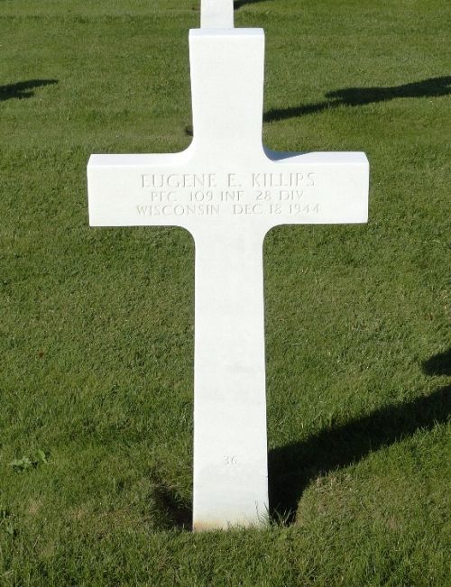 Eugene E. Killips attended Winslow, Franklin Junior and Washington Park High Schools. He was employed by the Massey-Harris Co.He was first buried at the Temporary American Military Cemetery of Foy, Belgium.