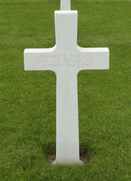 Pvt Homer E. Knight was a machinery operator before he enlisted at Fort McClellan, Alabama on 22 December 1943.Source of information: Raf Dyckmans, Carla Mans, www.abmc.gov, www.wwiimemorial.com, www.archives.gov - WWII Enlistment Record, www.ancestry.com - 1920/1940 Census / Headstone and Interment Record / U.S. WWII Draft Cards Young Men