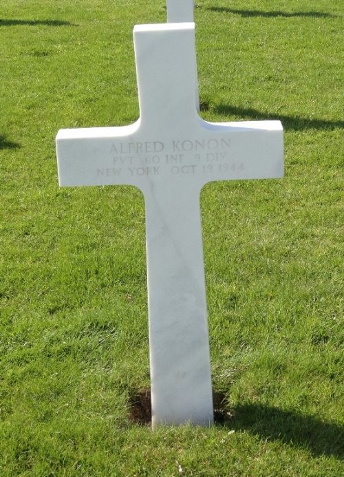 Pvt Alfred Konon worked on a farm before he enlisted in Fort Dix, New Jersey on 27 March 1944.Source of information: Peter Schouteten, Carla Mans, www.abmc.gov, www.wwiimemorial.com, www.archives.gov - WWII Enlistment Record, www.ancestry.com - Headstone and Interment Record / 1930/1940 Census, http://9thinfantrydivision.net