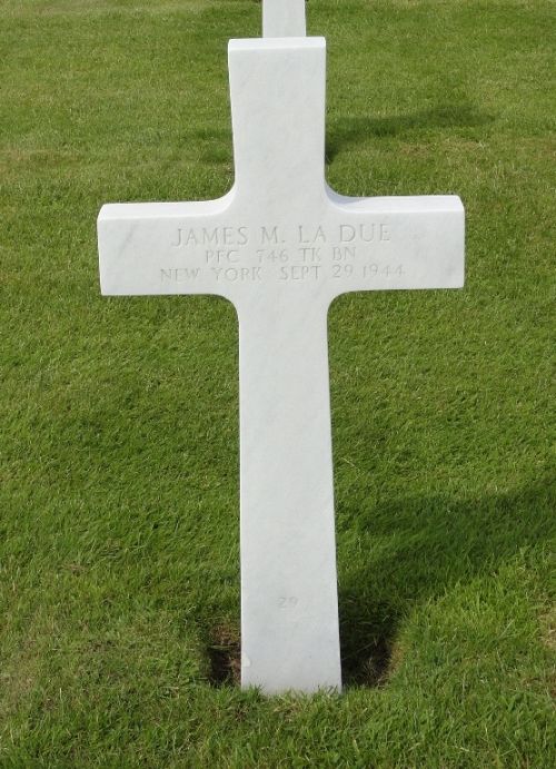 Pfc James M. La Due attended Waverly High School and was employed by the Lehigh Valley before he enlisted in Wilkes-Barre, Pennsylvania on 3 August 1943. He was sent overseas in February 1944.He was reported seriously wounded in action on 1 September 1944. In a letter to his parents, he stated that he had taken nine stitches in his forehead after being wounded in action but that he was all right and had been discharged from the hospital. The last letter his wife received from him, dated 24 September 1944, told her that he was out of the hospital and "I am going to fill a tank and that will be the last tank I fill before I come home."