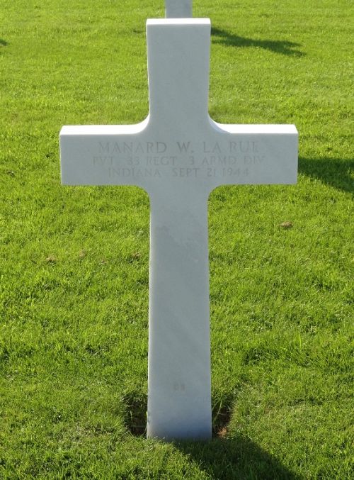 Pvt Manard W. La Rue enlisted in Evansville, Indiana on 23 December 1942.Source of information: Peter Schouteten, Kathy McDermott, www.abmc.gov, www.wwiimemorial.com, www.archives.gov – WWII Enlistment Record, www.ancestry.com - U.S., Headstone and Interment Records for U.S. Military Cemeteries on Foreign Soil / 1930 Census / U.S. WWII Draft Cards Young Men