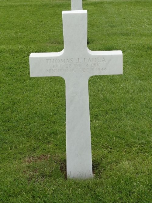 Pvt Thomas J. Laqua attended high school for three years and worked in the production of filter elements for cars and other devices.He enlisted at Fort Snelling, Minnesota on 1 May 1944.
