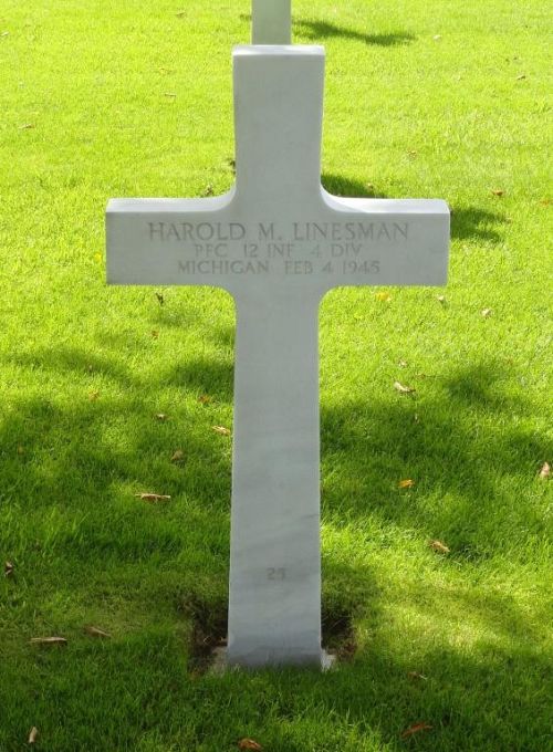 Pfc Harold M. Linesman worked in a machine shop before he enlisted at Fort Custer, Michigan on 26 March 1942.He was first buried at the Temporary American Military Cemetery of Foy, Belgium.