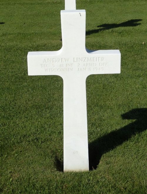 T/5 Andrew Linzmeier enlisted in Milwaukee, Wisconsin on 20 February 1941 and was sent overseas in December 1942, serving first in North Africa and, SicilyHe was first buried at the Temporary American Military Cemetery of Fosse, Belgium.
