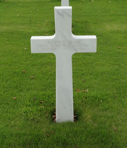T/5 Lloyd V. Mace was first buried at Temporary American Military Cemetery Fosse, Belgium Block J, Row 9, Grave 162.Source of information: Peter Schouteten, Carla Mans, www.abmc.gov, www.wwiimemorial.com, www.ancestry.com - Headstone and Interment Record / U.S. WWII Draft Cards Young Men / 1930 Census