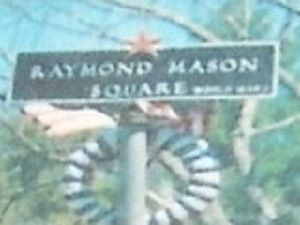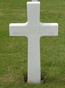 The Square on Route 104 and Walnut Street, near his childhood home in Bridgewater, Massachusetts is named in his honour.Pfc Raymond J. Mason was first buried at the Temporary American Military Cemetery of Fosse, Belgium.