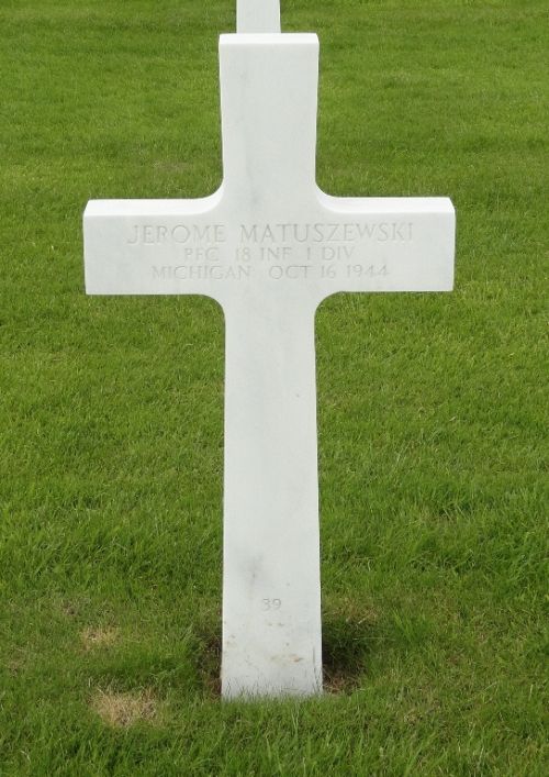 Pfc Jerome Matuszewski graduated from the Rogers City High School in 1942. He entered the service on 14 October 1943.He is remembered at the Saint Dominic Cemetery in New Metz, Presque Isle County, Michigan.