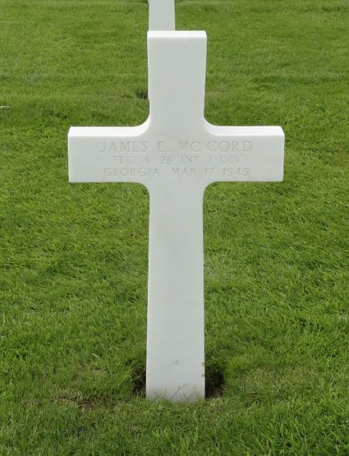 T/4 James E. Mc Cord was graduated from Hapeville High School and attended Georgia Evening College. Before entering the army he was employed by the Atlanta Paper Company.T/4 James E. Mc Cord enlisted at Fort Mc Pherson, Atlanta, Georgia on 28 January 1943. He went overseas to England in October 1943, when the Allied armies were going through France and entering Germany. He asked for active combat duty and had special infantry training in France and Belgium.