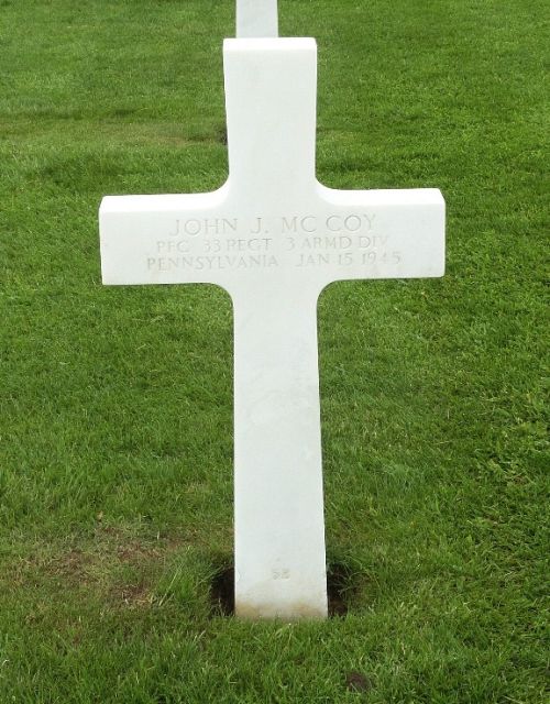 Pfc John J. Mc Coy enlisted in New Cumberland, Pennsylvania on 22 February 1944.He was first buried at Temporary American Military Cemetery Henri-Chapelle, Belgium Block GGG, Row 1, Grave 13.
