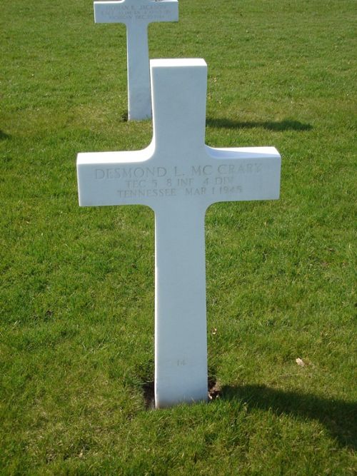 T/5 Desmond L. Mc Crary was a chauffeur before he enlisted at Camp Forrest, Tennessee on 30 June 1943.He was first buried at the Temporary American Military Cemetery of Foy, Belgium.