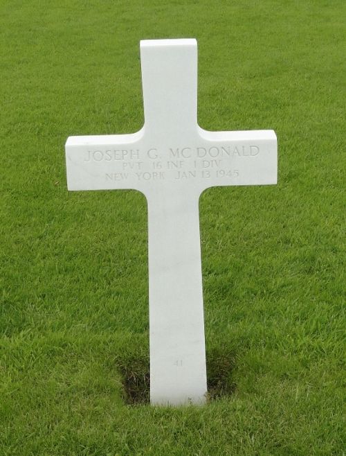 Joseph G. Mc Donald was a metal worker before he enlisted in New York City, New York on 5 August 1943.Source of information: Raf Dyckmans, www.abmc.gov, www.wwiimemorial.com, www.archives.gov - WWII Enlistment Record, Fold 3 - 1946 WWII Casualty Report