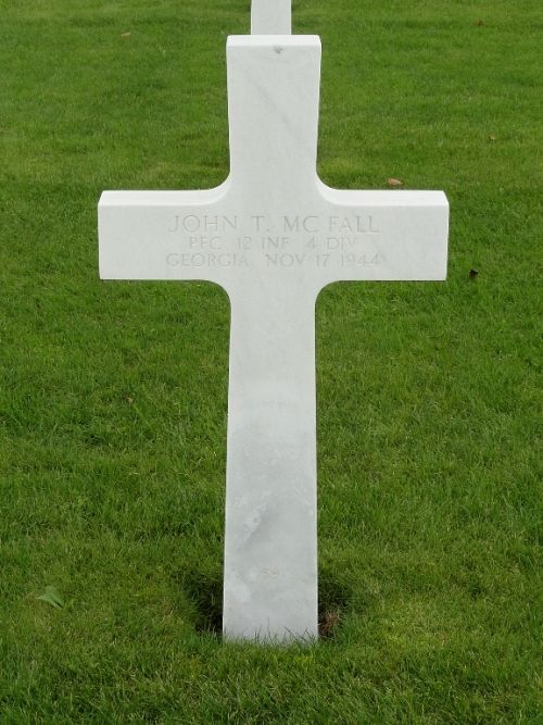 Pfc John T. Mc Fall worked on a farm before he enlisted at Fort McPherson, Georgia on 14 September 1943.Source of information: Danny van der Groen, Carla Mans, www.abmc.gov, www.wwiimemorial.com, www.archives.gov – WWII Enlistment Record, www.ancestry.com – Headstone and Interment Record / U.S. WWII Draft Cards Young Men / 1930/1940 Census