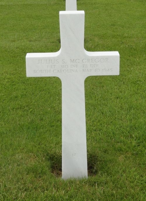 1st Lt Julius S. Mc Gregor was first buried at Block D-4, Row 1, Grave 19.Source of information: Peter Schouteten, www.abmc.gov, www.wwiimemorial.com - Frank C. Mc Gregor, www.ancestry.com - Headstone and Interment Record / 1930 Census, www.findagrave.com - Richard Blunk