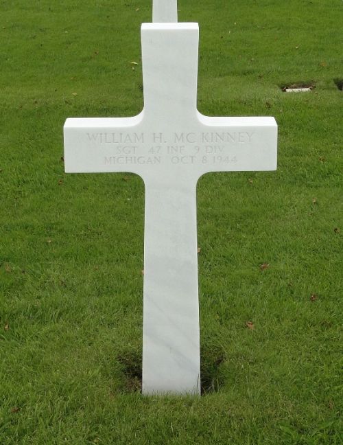 Sgt William H. Mc Kinney was first buried at Temporary American Military Cemetery Henri-Chapelle, Belgium Block F, Row 2, Grave 35.