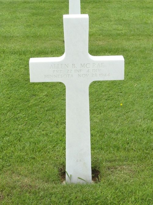 Pvt Allen B. Mc Rae enlisted at Fort Snelling, Minnesota on 11 May 1944. Overseas for only one month, he received his preliminary training at Camp Fannin, Texas.He attended high school for 2 years and was employed by Northern Pump Co.