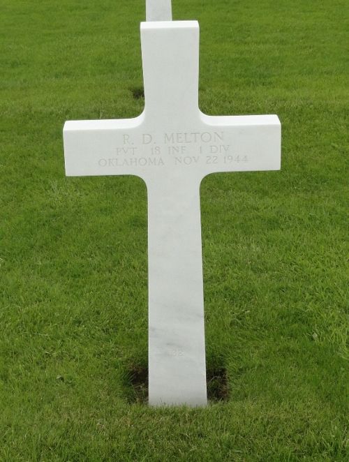 Pvt R. D. Melton attended Healdton High School and was the manager of Thompson Theaters.He enlisted at Fort Sill, Oklahoma on 10 April 1944 and trained at Camp Hood, Texas. He was sent overseas in September 1944.