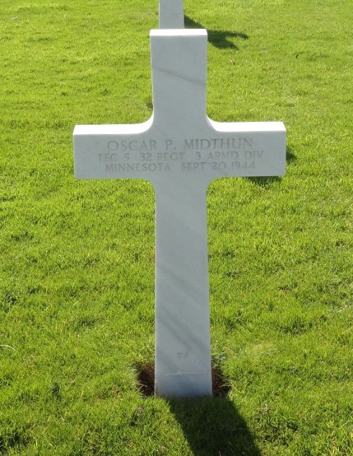T/5 Oscar P. Midthun was first buried at the Temporary American Military Cemetery Fosse, Belgium at Block J, Row 7, Grave 139.Source of information: Peter Schouteten, Astrid van Erp, Carla Mans, www.abmc.gov, www.wwiimemorial.com, www.ancestry.com - Headstone and Interment Record / 1920/1930 Census, www.myheritage.nl - Family Tree