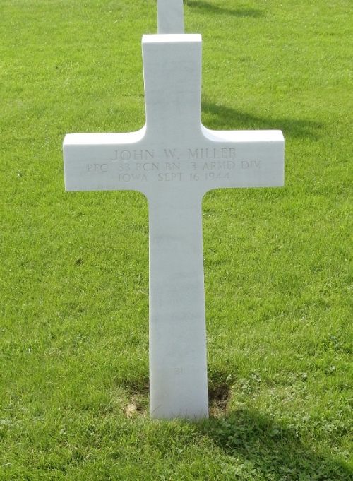 Pfc John W. Miller was first buried at Temporary American Military Cemetery Fosse, Belgium Block C, Row 5, Grave 96.Source of information: Peter Schouteten, Carla Mans, www.abmc.gov, www.wwiimemorial.com, www.ancestry.com - Headstone and Interment Record / U.S. WWII Draft Cards Young Men / 1920 Census / Iowa, Births and Christenings Index