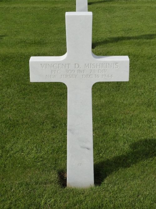 Pfc Vincent D. Mishkinis was first buried at Block LL, Row 8, Grave 159.Source of information: Peter Schouteten, Richard Blunk, Terry Hirsch, Carla Mans, www.abmc.gov, www.findagrave.com – James L. Cooper, www.wwiimemorial.com, www.ancestry.com - Headstone and Interment Records / 1920/1930/1940 Census / U.S. WWII Draft Cards Young Men
