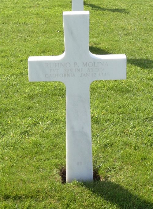 Pvt Rufino P. Molina attended high school for one year and worked in a foundry before he enlisted in Santa Fe, New Mexico on 31 January 1944.Source of information: Peter Schouteten, Carla Mans, www.abmc.gov, www.wwiimemorial.com, www.archives.gov – WWII Enlistment Record, www.ancestry.com - Headstone and Interment Record / U.S. WWII Draft Cards Young Men, http://83rdinfdivdocs.org – After Action Report